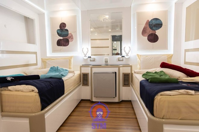 Falcon is a 45.50m steel vessel that caters to her 30 guests with 15 cabins and en-suite bathrooms; a spacious air-conditioned lounge, and dining area, and several outdoor relaxation areas. Equivalent to a floating dive center, theFalcon is fully equipped with underwater scooters, an unlimited selection of tanks, and other basic dive gear.